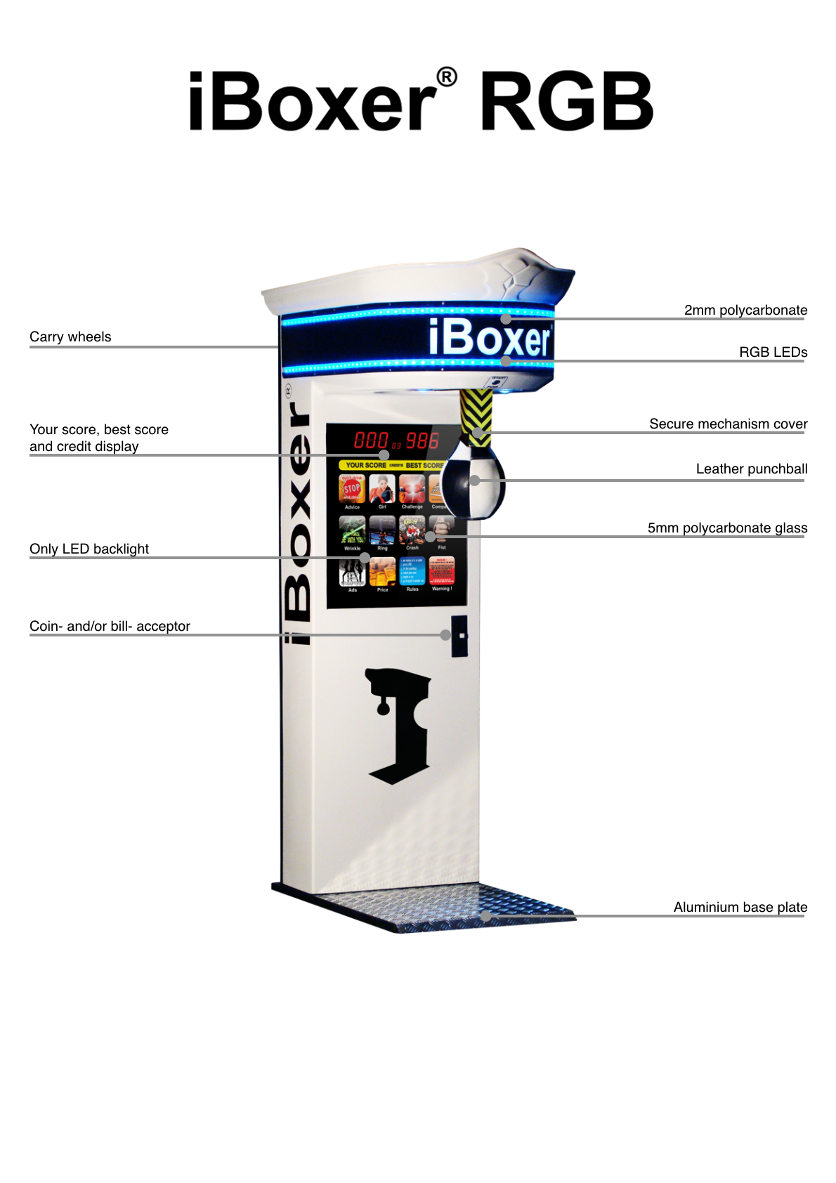 Der iBoxer® RGB ist ein moderner Boxautomat, der durch seine stylische RGB-LED-Beleuchtung und das iPhone-inspirierte Design sofort ins Auge fällt. Er wurde für höchste Beanspruchung und vielseitige Einsatzbereiche konzipiert – ob in Spielhallen, Freizeitparks oder Eventlocations.